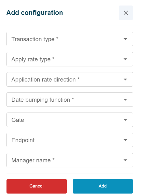 To add new account configuration press +Add button in configuration field and set up the transaction type and rates, which will add or deduct funds from balance by settings described in Accounts Configuration. Optionally, gate and endpoint can be selected - if they are left empty, balance configuration will work for all gates and endpoints of selected Merchant.