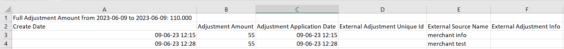 To export all adjustments for specific balance press the Export button, specify period of time and after that press Export button. The csv file of adjustments will download automatically.