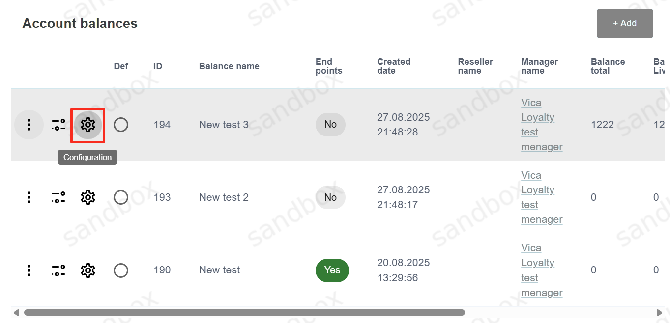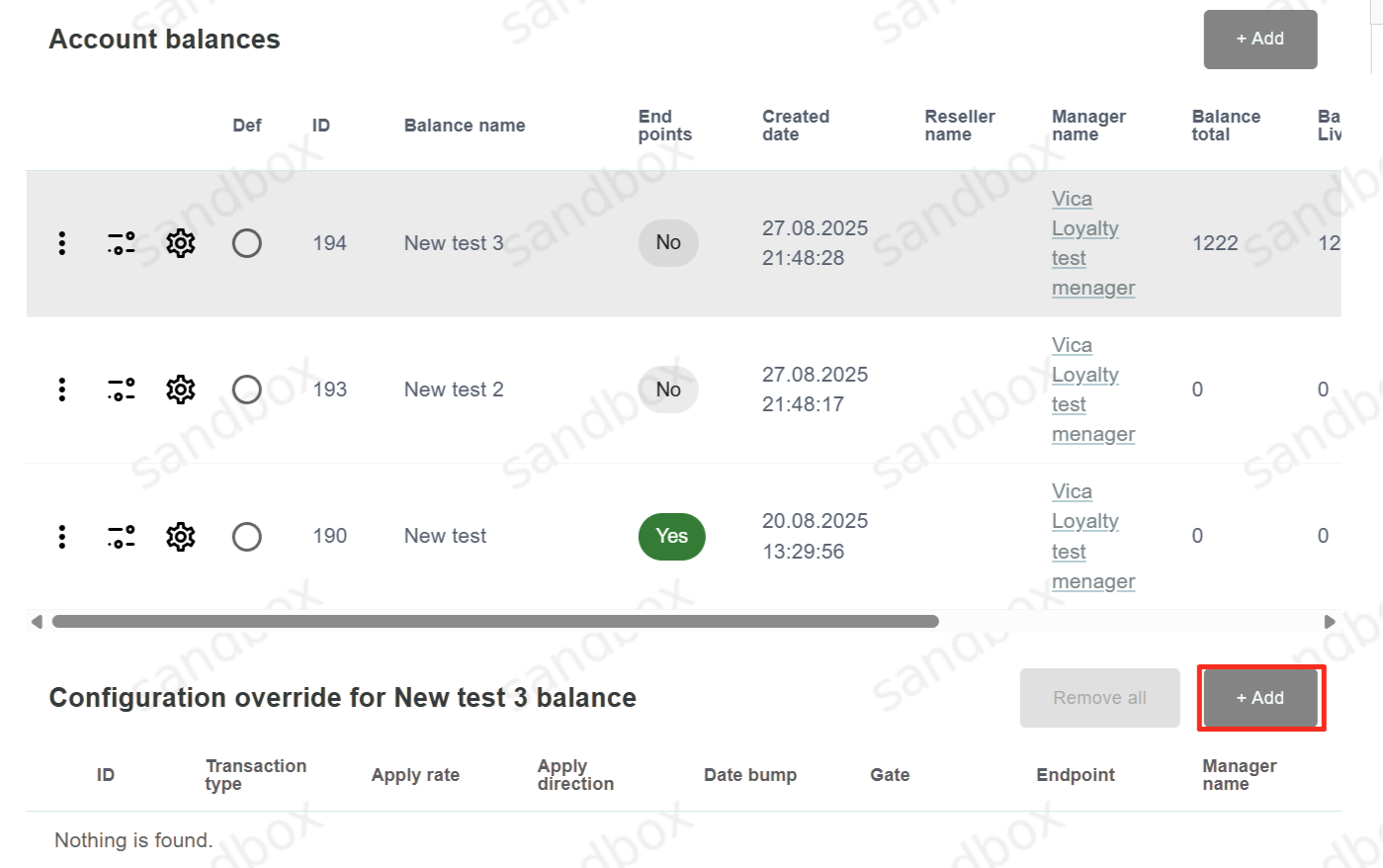 Example: For balance 191 Sale and Payout operations are overrode, that means for this balance main configuration doesn’t affect.