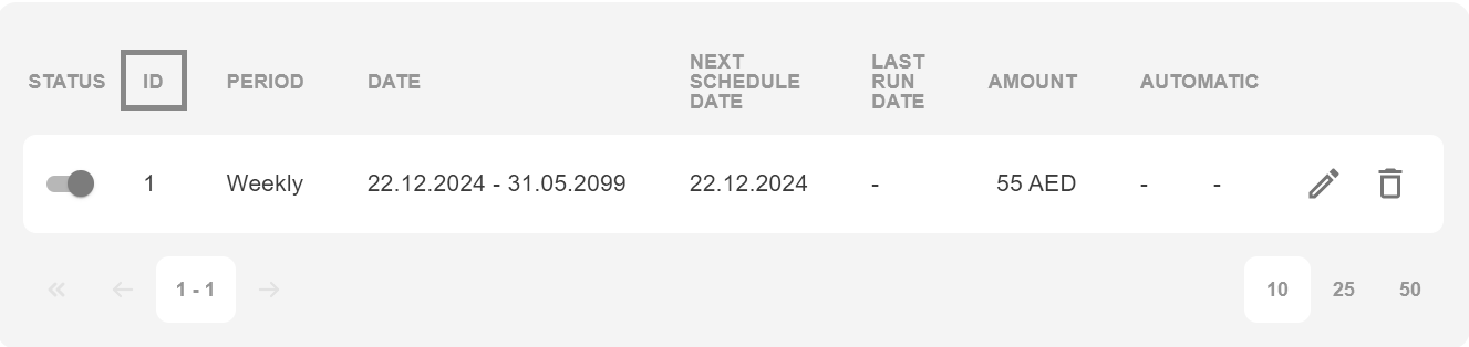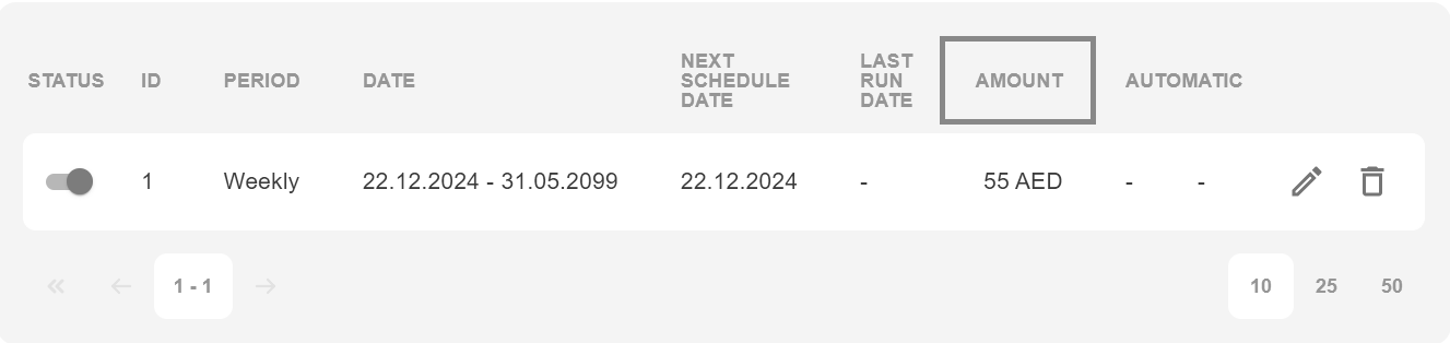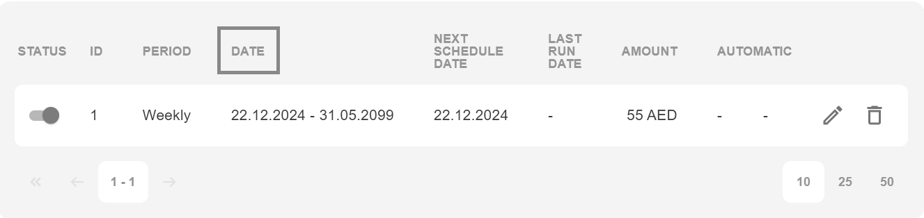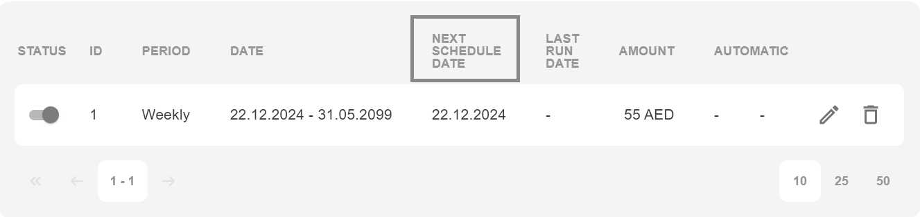 This functionality helps to configure a monthly/weekly fee, which can be set up on the appointed dates every month/week. Scheduled for balance adjustments can be made via Add+ button :