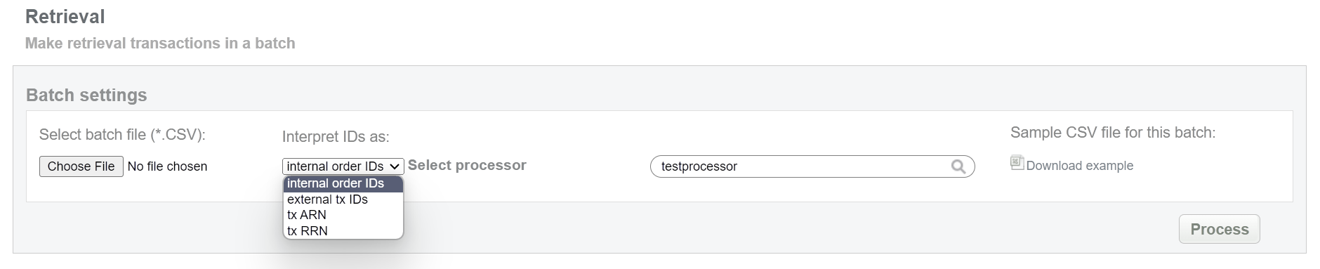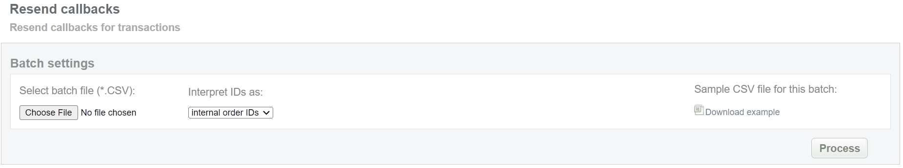 This batch operation can be useful if information on the final status of transactions is available in Sarexspay system and for some reason is not available in the Connecting Party system. Collect the order IDs, assigned by Sarexspay system to the CSV file and upload it to send new callback notifications. An example of CSV file for upload is available on the same screen.