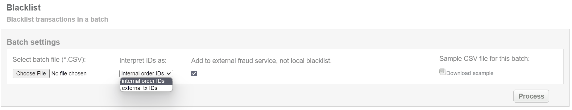 This batch operation, in according to specified input, puts cards in blacklist or external fraud system if such is set up. Collect the order IDs, assigned by Sarexspay system to the CSV file and upload it to blacklist card of selected transactions. An example of CSV file for upload is available on the same screen.