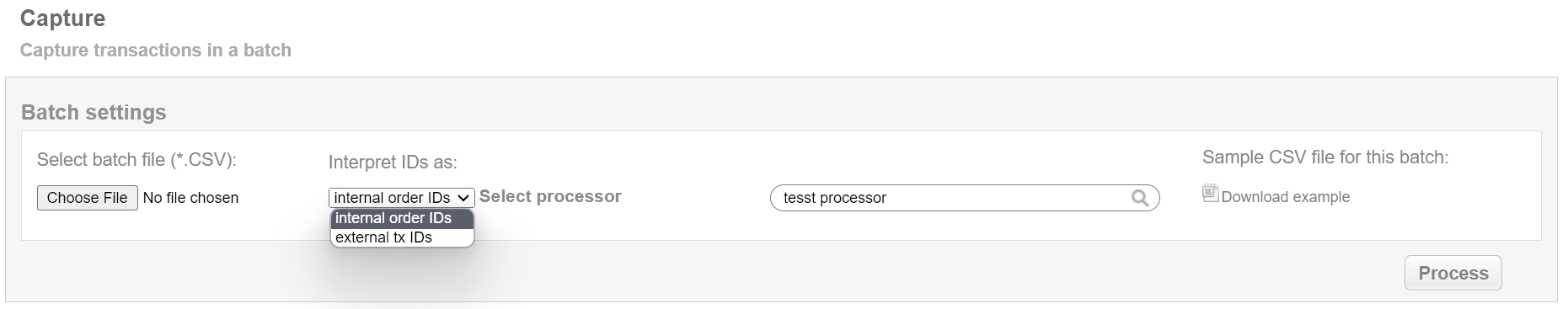 This batch operation can be useful for deducting the locked amount from preauth transactions (preauth should be in approved final status) in according to specified input. Collect the order IDs, assigned by Sarexspay system to the CSV file and upload it to make capture of selected transactions. An example of CSV file for upload is available on the same screen.