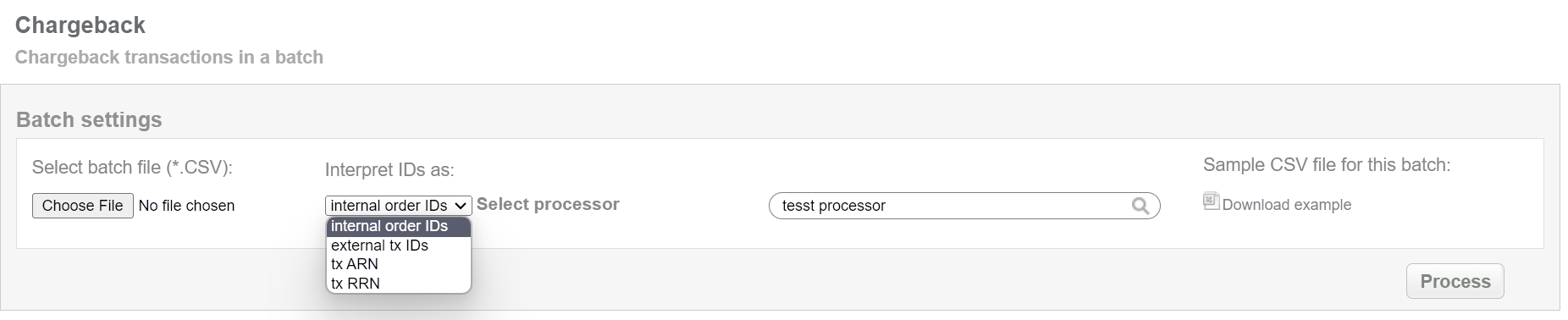 This batch operation can be useful if for some reason reversal was not made to prevent a chargeback and creating chargeback transaction according to specified input is needed. Collect the order IDs, assigned by Sarexspay system to the CSV file and upload it to make chargebacks for selected transactions. An example of CSV file for upload is available on the same screen.