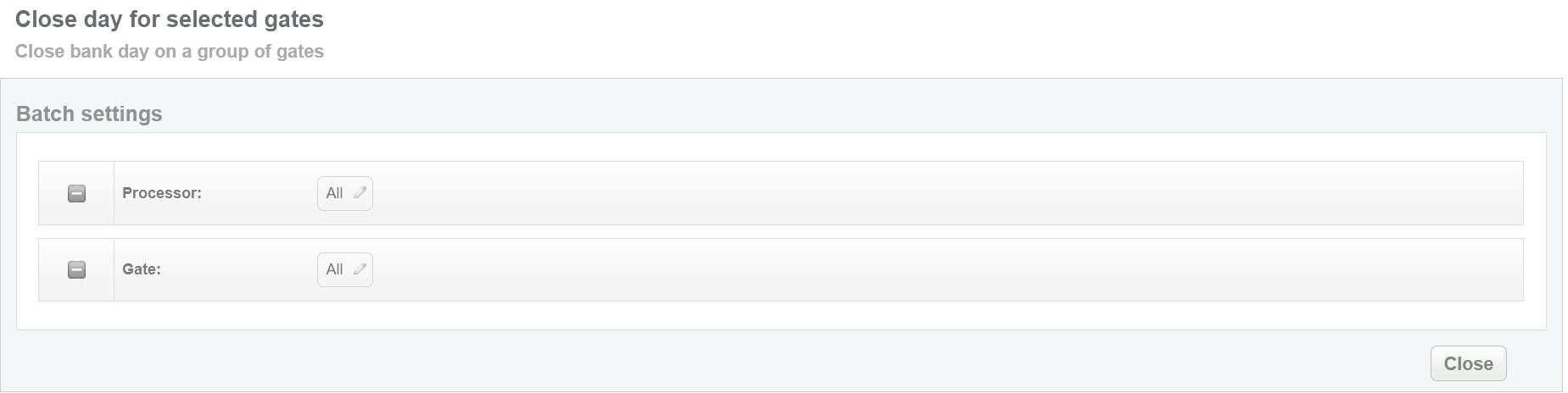 This batch operation can be useful for closing bank day on a group of gates. Select the gate or processor IDs in order to close bank days on all gates.