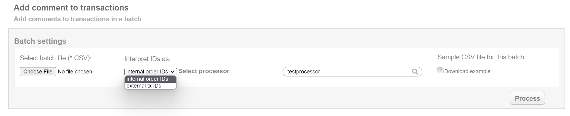 This batch operation can be useful for adding a or an additional comment to transactions in according to specified input. Collect the order IDs, assigned by Sarexspay system to the CSV file and upload it to add comment for the selected transactions. An example of CSV file for upload is available on the same screen.