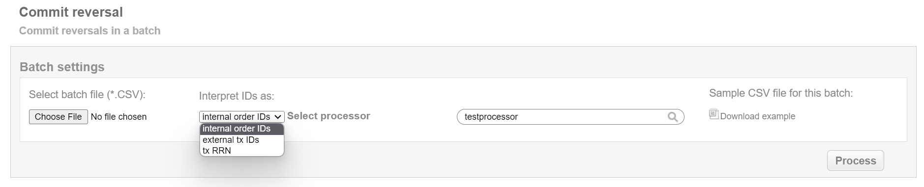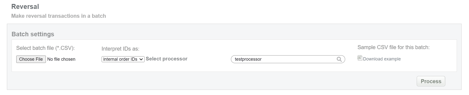 This batch operation can be useful for initiating reversal transactions in according to specified input. Collect the order IDs, assigned by Sarexspay system to the CSV file and upload it to make reversal of selected transactions. An example of CSV file for upload is available on the same screen.