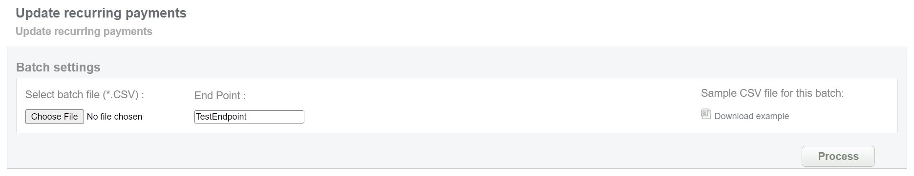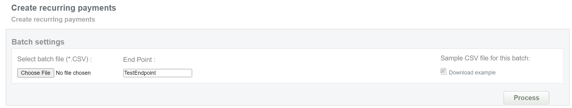 This batch operation can be useful for initiating recurring payments for transactions that require regular debits with the same data. Collect the order IDs, assigned by Sarexspay system and enter all information to the CSV file and upload it to create recurring payments. An example of CSV file for upload is available on the same screen.