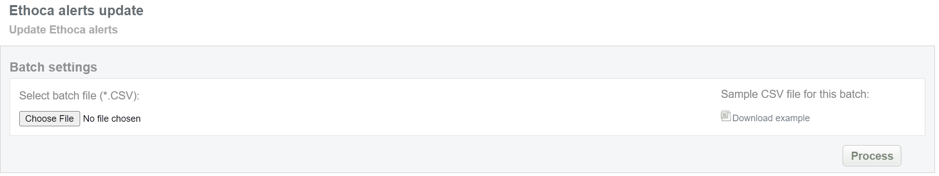 This batch operation can be useful for updating Ethoca statuses. Collect the order IDs, assigned by Sarexspay system to the CSV file and upload it to send statuses to Ethoca system. An example of CSV file for upload is available on the same screen.