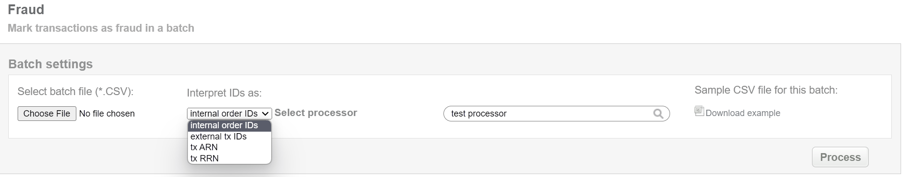 If Connecting Party suspects transaction to be fraudulent, then this batch operation can be useful for marking transactions as fraud in according to specified input. Collect the order IDs, assigned by Sarexspay system to the CSV file and upload it to mark selected transactions as fraud. An example of CSV file for upload is available on the same screen.