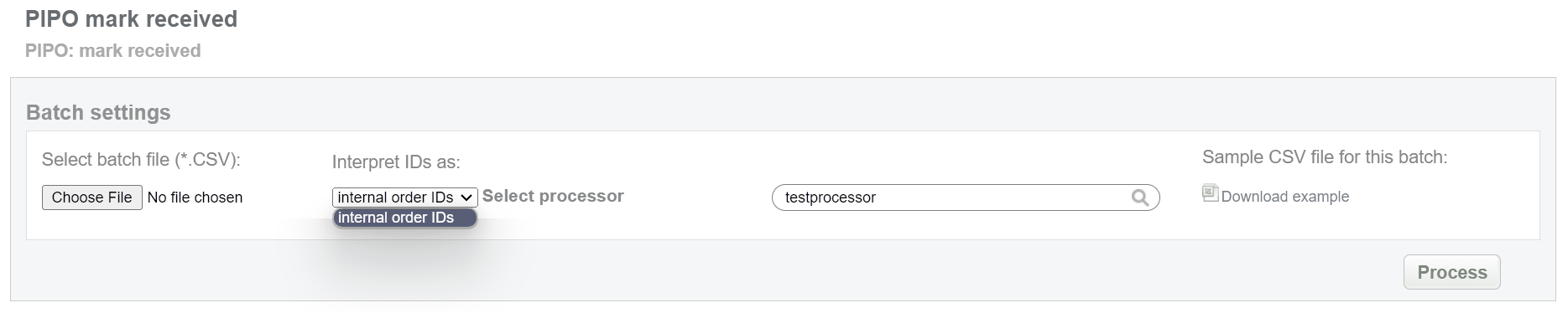 This batch allows to mark pending bank transfer as received. This status equals to “approved” for preauth transaction. Collect order IDs, assigned by Sarexspay system and enter all information to the CSV file and upload it to mark PIPO payments as received. An example of CSV file for upload is available on the same screen.