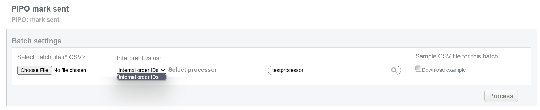 This batch operation allows to mark pending bank transfer as sent (but not received yet). This status equals to “processing” for preauth transaction. Collect order IDs, assigned by Sarexspay system and enter all information to the CSV file and upload it to mark PIPO payments as sent. An example of CSV file for upload is available on the same screen.