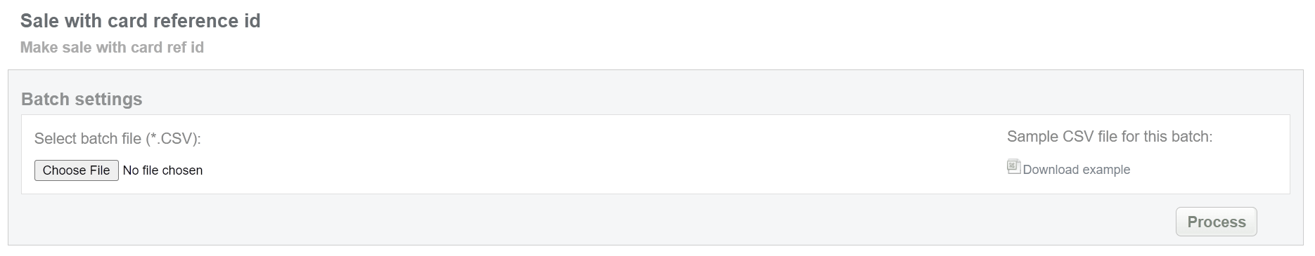 This batch operation can be useful for initiating sale without any card information using only card reference ID. Collect the Endpoint and Card reference IDs, assigned by Sarexspay system and enter all information to the CSV file and upload it to initiate sale transactions with card reference ID. An example of CSV file for upload is available on the same screen.