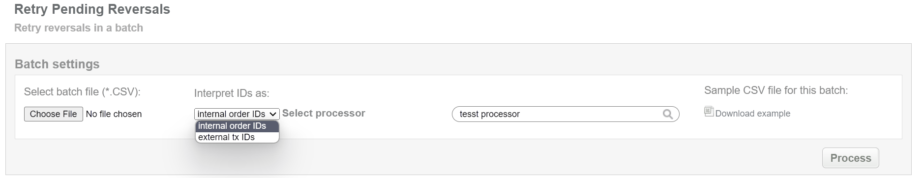 This batch operation re-sends reversal request for pending reversals in according to specified input. Collect the order IDs, assigned by Sarexspay system to the CSV file and upload it to make reversal of selected transactions. An example of CSV file for upload is available on the same screen.