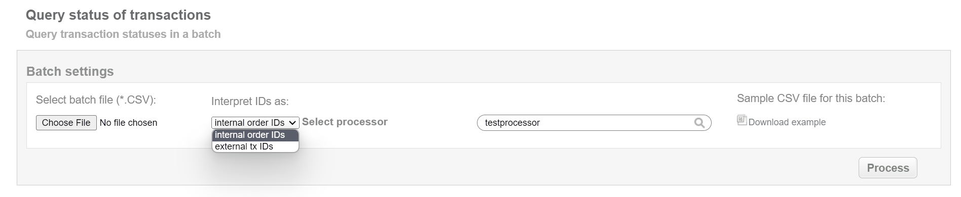 This batch operation can be useful for requesting status of transactions (doesn’t matter in what status) in according to specified input. Collect the order IDs, assigned by Sarexspay system to the CSV file and upload it to request status of the selected transactions. An example of CSV file for upload is available on the same screen.