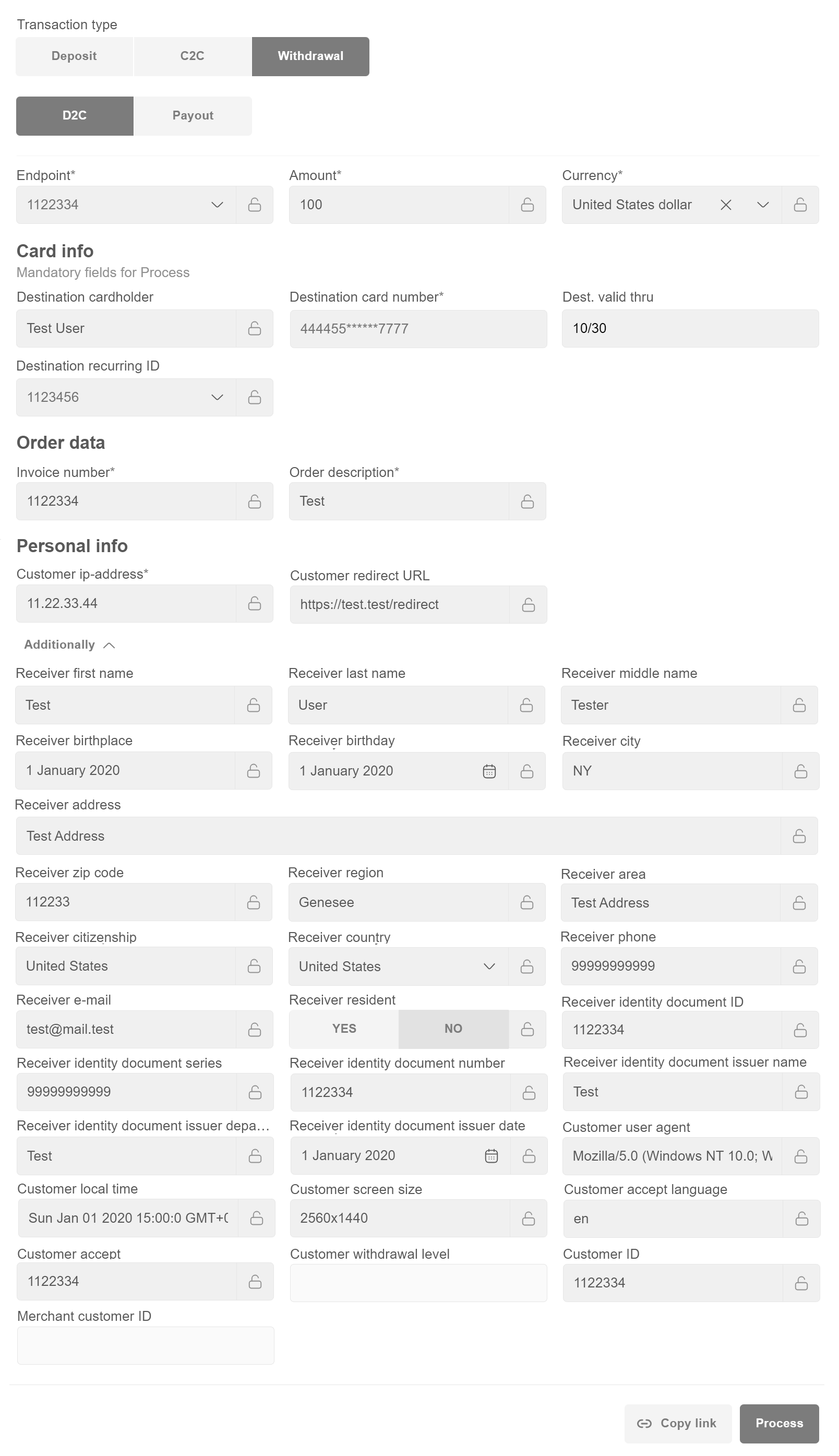 When filling in the Customer ID field, Personal info (First name, Last name,City, Address, Zip code, Phone, E-mail, Country) sections will be filled in automatically.