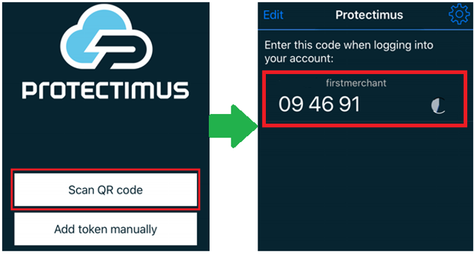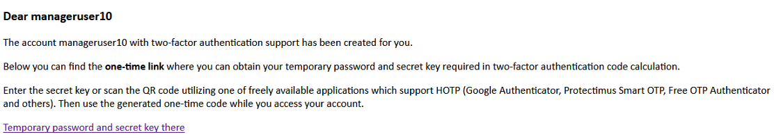 To calculate the second factor, scan the QR code or enter the secret key in any available application that supports HOTP (Google Authenticator, Protectimus Smart OTP, Free OTP Authenticator and others):