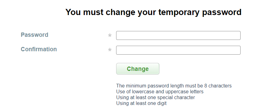 Upon initial access to Sarexspay UI, after logging in, the Merchant employee will be asked to create and enter a new password.