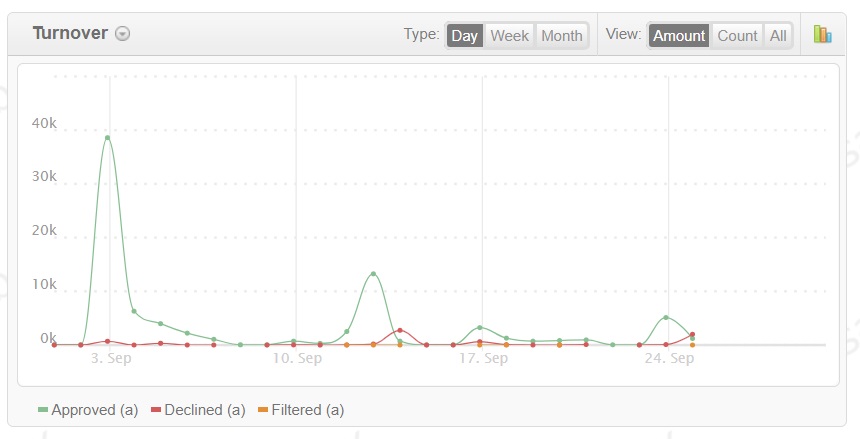 The graph shows the proportions between successful, declined and filtered transactions for a selected period of time.