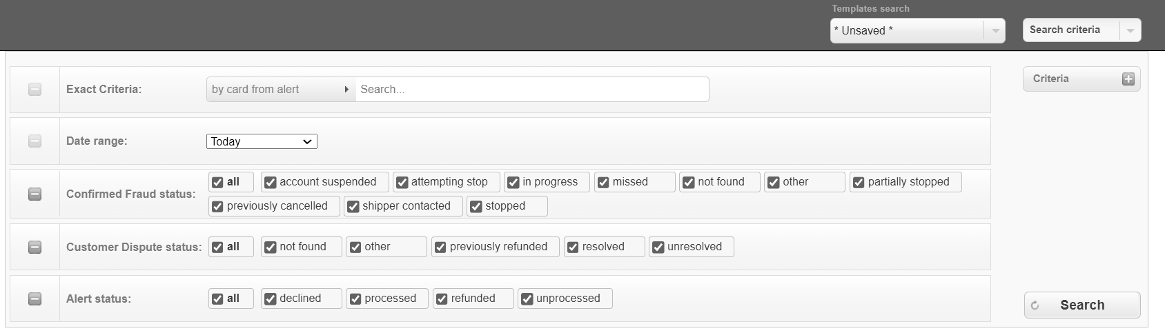 Select one or more search criteria and click Search to find the needed transactions.