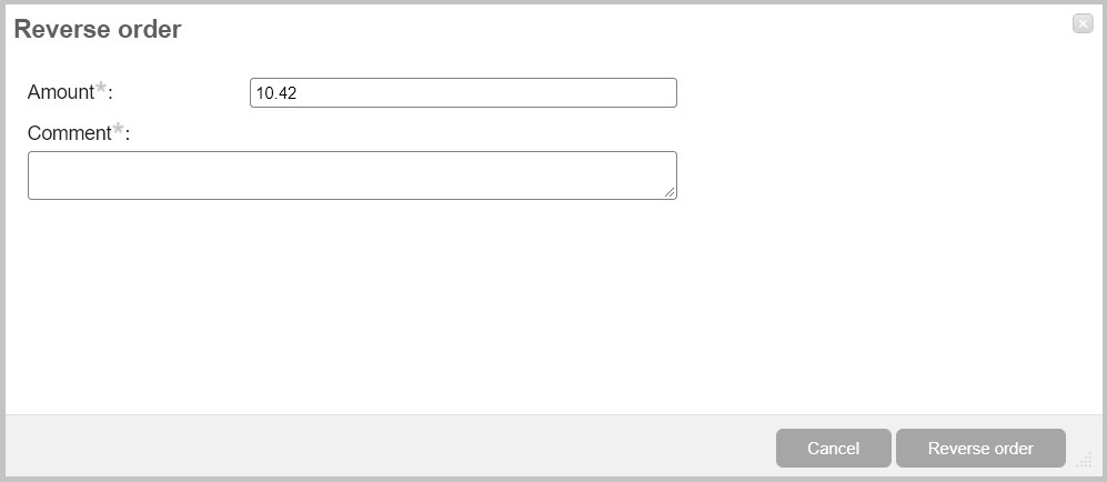 In this dialog box specify the amount of reversal. It can be the entire amount of the order, or only a part of it for cases where the merchant refunds payment for certain goods that are part of one order. In the Comment field a description of this refund can be added.